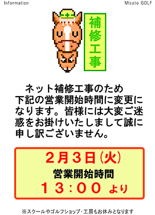 2026年1月23日 / 最終更新日時 : 2026年1月24日 misatogolf お客様へお知らせ 営業時間変更のお知らせ 2月3日(火)に防球ネットの補修工事を行います。 午後1時からオープンオープンいたします ご利用の皆様にはご迷惑をおかけして申し訳ございません。 何卒宜しくご了承ください。